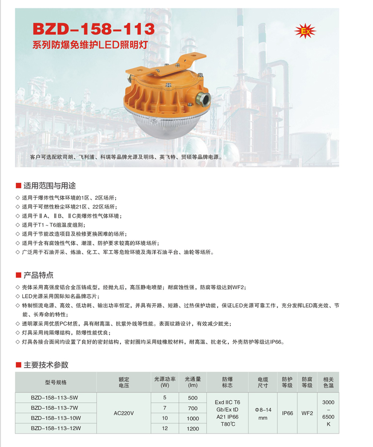■BZD158-113产品特点 ◇壳体采用高强度铝合金压铸成型,经抛丸后,高压静电喷塑耐腐蚀性强,防腐等级达到WF2LED光源采用国际知名品牌芯片; ◇特制恒流电源、高效、低功耗、输出功率恒定,并具有开路、短路、过热保护功能,保证LED光源可靠工作,充分发挥LED高光效、节能、长寿命的特性; ◇透明罩采用钢化玻璃,具有耐高温、耐热剧变等性能; ◇灯具采用纯隔爆结构,防爆性能优良;灯具各接合面间均设置了良好的密封结构,密封圈均采用硅橡胶材料,耐高温、抗老化,外壳防护等级达P66