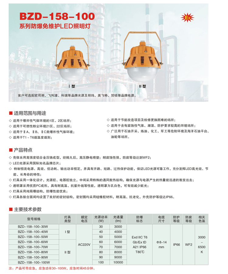 ◇灯各接合面间均设置了良好的密封结构,密封圈均采用硅橡胶材料,高、抗老化,外壳防护等级达P66